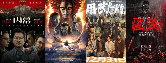 目前已有《阿凡达:火与烬》《内幕》《比如父子》等30多部影片定档12月,亦有《匿杀》《用武之地》《无名之辈:意义非凡》《过家家》等多部宣布进军元旦档。1月也有《爆水管》《飞行家》等多部提前布局。